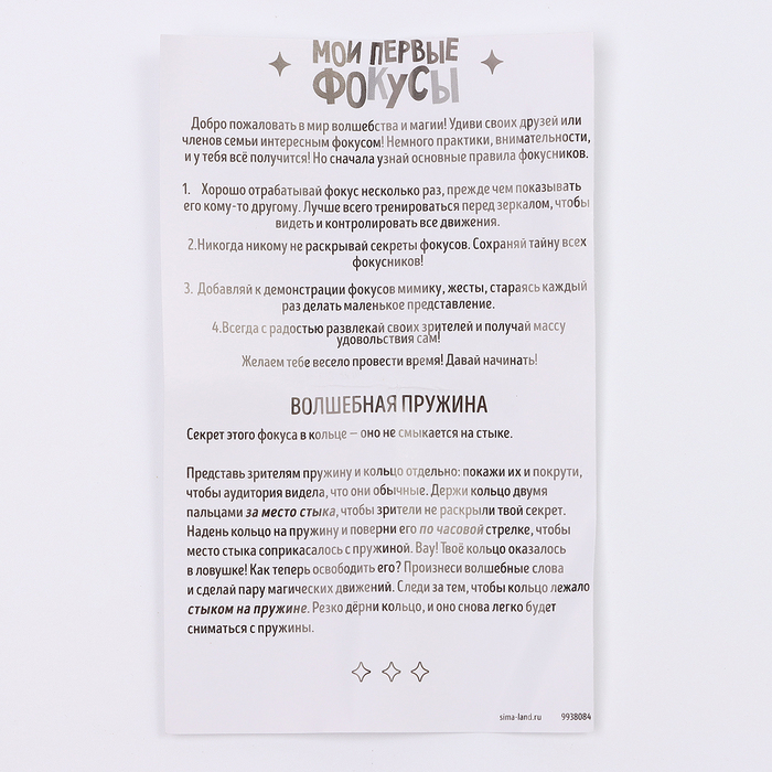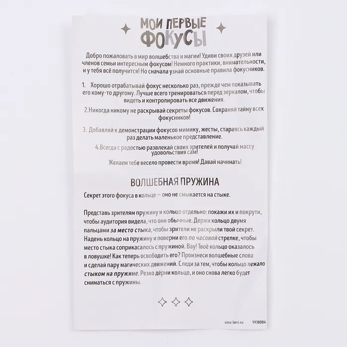 Представь зрителям пружину и кольцо отдельно: покажи их и покрути. Держи кольцо двумя пальцами за место стыка, чтобы не раскрыть секрет. Надень кольцо на пружину и поверни его по часовой стрелке, чтобы место стыка соприкасалось с пружиной. Кольцо оказалось в ловушке! Произнеси волшебные слова и сделай пару магических движений. Следи за тем, чтобы кольцо лежало стыком на пружине. Резко дёрни кольцо и оно легко будет сниматься с пружины.