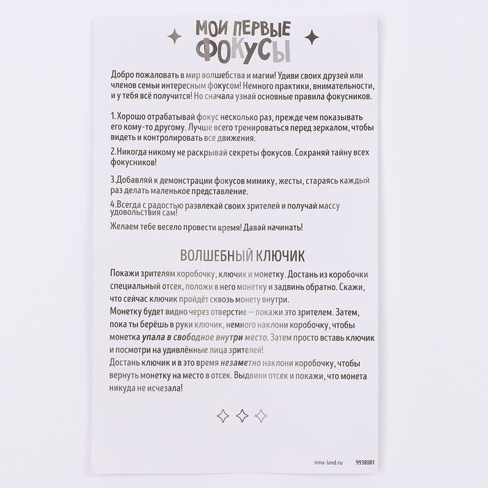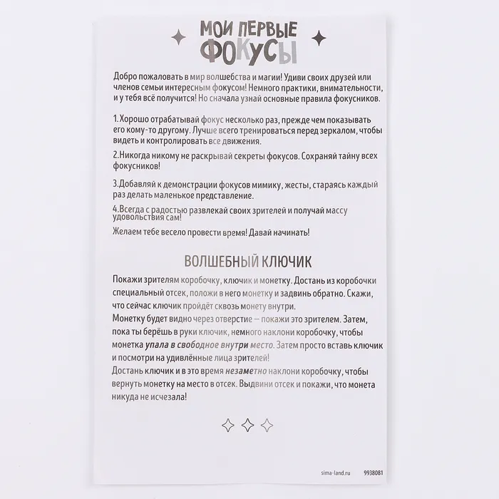 Покажи зрителям коробочку, ключик и монетку. Достань из коробочки специальный отсек, положи монетку и задвинь обратно. Скажи, что сейчас ключик пройдёт сквозь монету внутри. Монетку будет видно через отверстие — покажи это зрителем. Пока берёшь в руки ключик, наклони коробочку, чтобы монетка упала в свободное место внутри. Затем просто вставь ключик. Достань ключ, в это время незаметно наклони коробочку, чтобы вернуть монетку на место в отсек. Выдвини отсек и покажи, что монета никуда не исчезала!