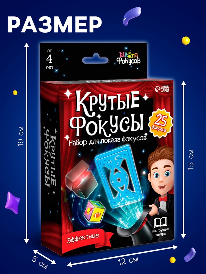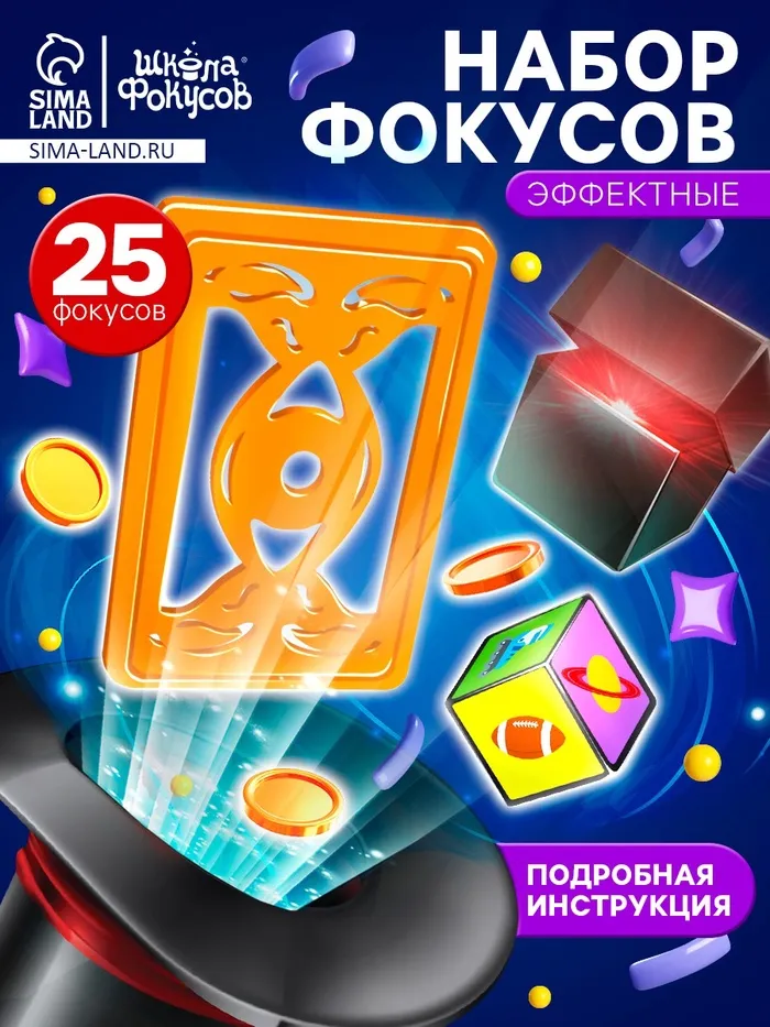 - 25 профессиональных фокусов. В набор входит всё необходимое для эффектных номеров. Каждый трюк сопровождается подробной инструкцией, чтобы ребёнок быстро разобрался в механике.