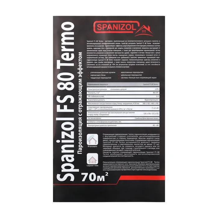 Фольгированная пароизоляция с отражающим эффектом, на основе прочного полипропиленового нетканого полотна. Для помещений с высокой влажностью и температурой (парилки, помывочные). Защищает утеплитель, элементы конструкций от пара и влаги, снижает потери тепла за счет его отражения. Устойчива к химическим и биологическим воздействиям. Область применения: бани и сауны, теплые кровли, стены мансарды, перекрытия, техническая изоляция воздуховодов, водогрейных аппаратов, котлов до 140 С.