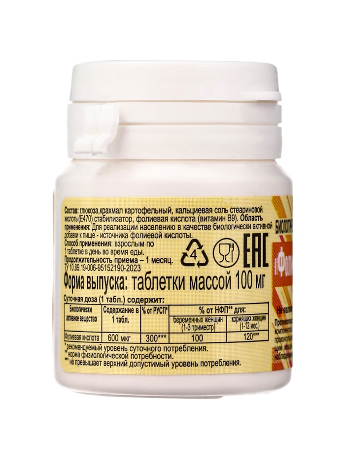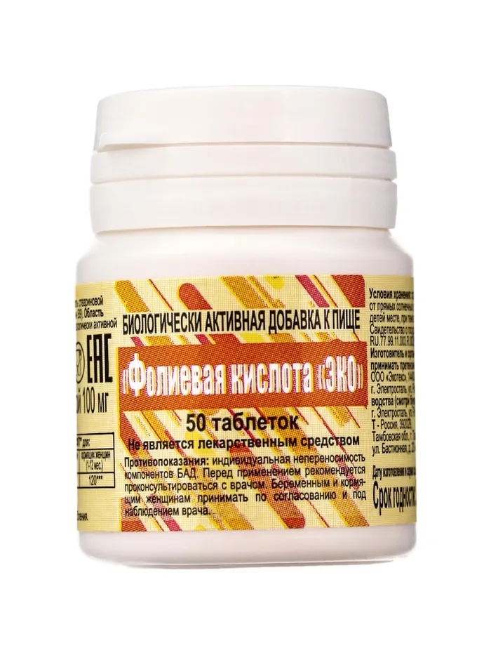Фолиевая кислота «ЭКО», №50, 100 мг — важный витамин для поддержания здоровья организма, особенно для женщин в период планирования беременности и в первые недели беременности. Фолиевая кислота участвует в синтезе ДНК, поддерживает нормальное кроветворение и способствует правильному развитию клеток организма.