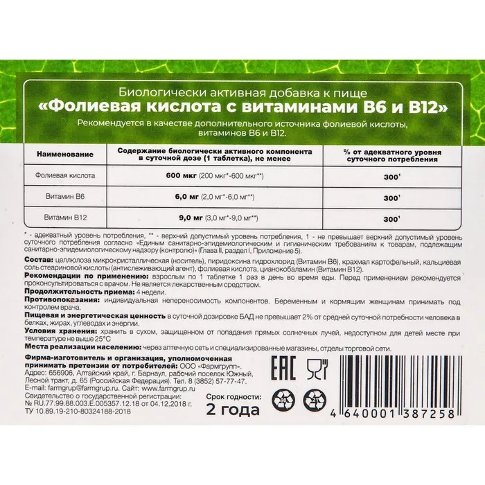 Состав: носитель микрокристаллическая целлюлоза (Е460), пиридоксина гидрохлорид, крахмал картофельный, антислеживающий агент стеарат кальция (Е470), фолиевая кислота, цианокобаламин.