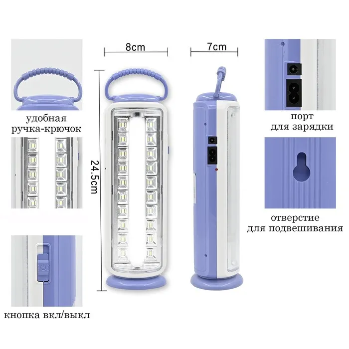 Фонарь кемпинговый аккумуляторный, 5 Вт, 1200 мАч, 500 лм, 20 LED, IP44, 8 х 24.5 см — Характеристики