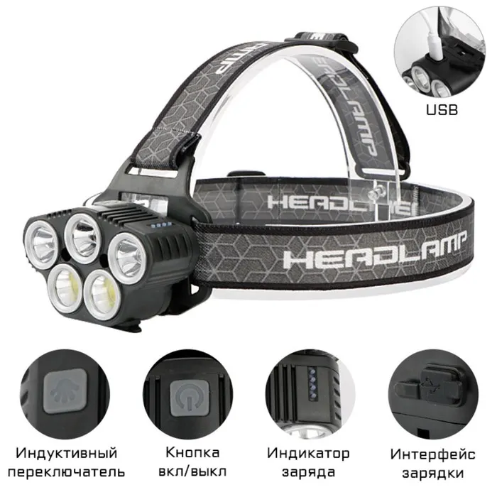 Фонарь налобный аккумуляторный, 20 Вт, 1200 мАч, диод 3 XPE 2 COB, сенсор, type-c — Характеристики