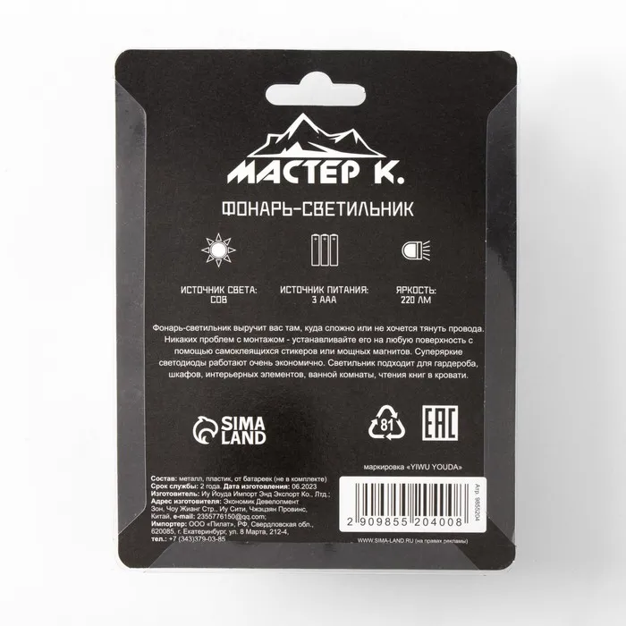 Фонарь-светильник "Мастер К", 220 лм, COB, 3 ААА, магнит, клейкая основа, 9 х 8.8 х 2.8 см — Характеристики