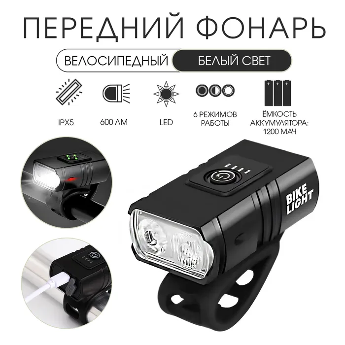 Фонарь велосипедный передний аккумуляторный, водонепроницаемый, 6 режимов