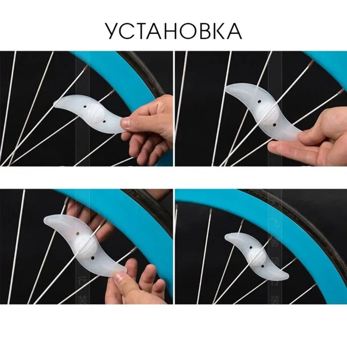 Велосипедный фонарь предназначен для крепления на спицу колеса. Во время движения велосипеда создает яркий красочный круг внутри колеса, что делает велосипед заметнее на дороге в темное время суток. При использовании нескольких таких катафотов одновременно круг будет ярче.Корпус изготовлен из водонепроницаемого материала, что позволит ездить в дождь и по неглубоким лужам.Легко крепится на спицу колеса. Для крепления не нужны специальные инструменты: у подсветки есть прорезь, в которой фиксируется спица, по бокам фонарь зажат соседними спицами.