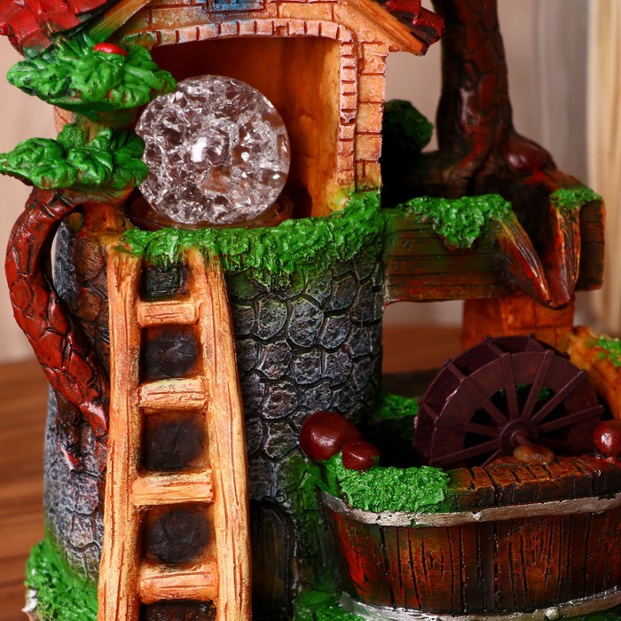 Неспешное течение воды далеко унесёт дурные мысли. Чуть слышное журчание, завораживающее вращение стеклянного шара и колеса мельницы успокоят нервы и принесут умиротворение. Фонтан "Домик лестница" 12х19х27 см (с подсветкой) — идеальный декор для создания уголка отдыха, приносящего гармонию и душевный покой.