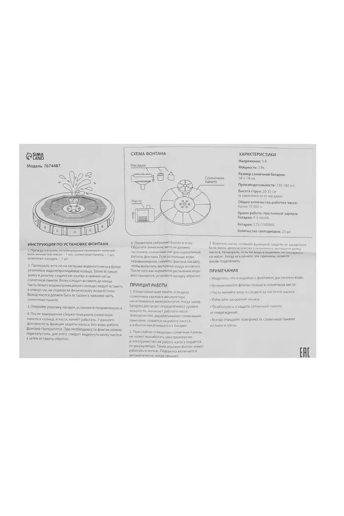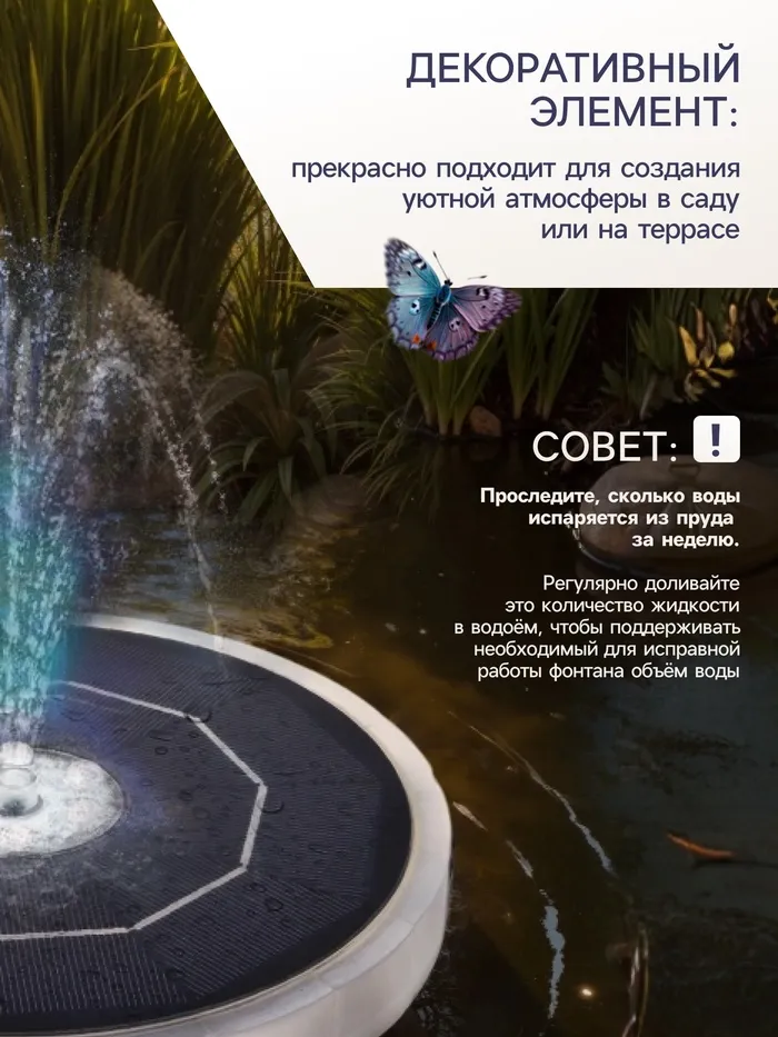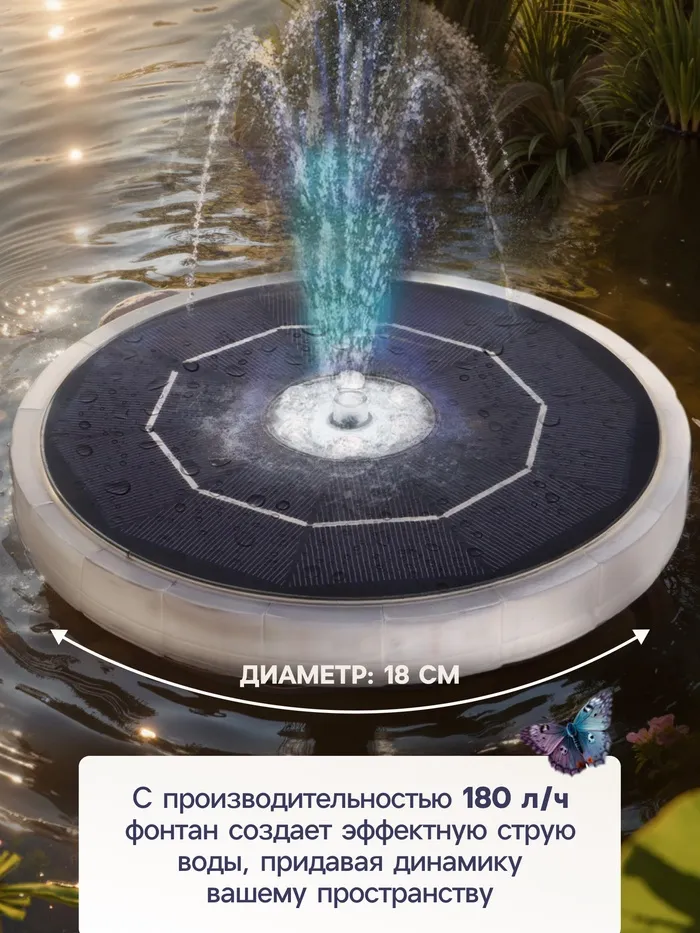 Фонтан на солнечной батарее, h=0,55 метра, 180 л/ч, 7 Вт, LED-подсветка, JT-180-23LED — Характеристики