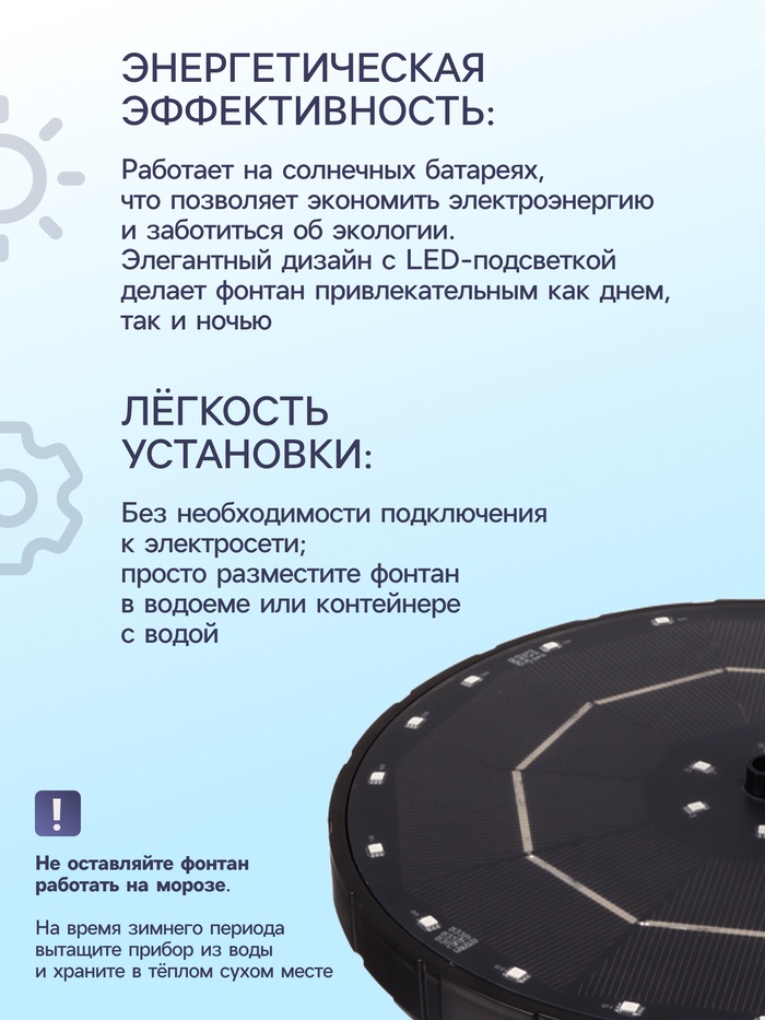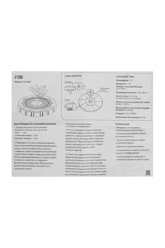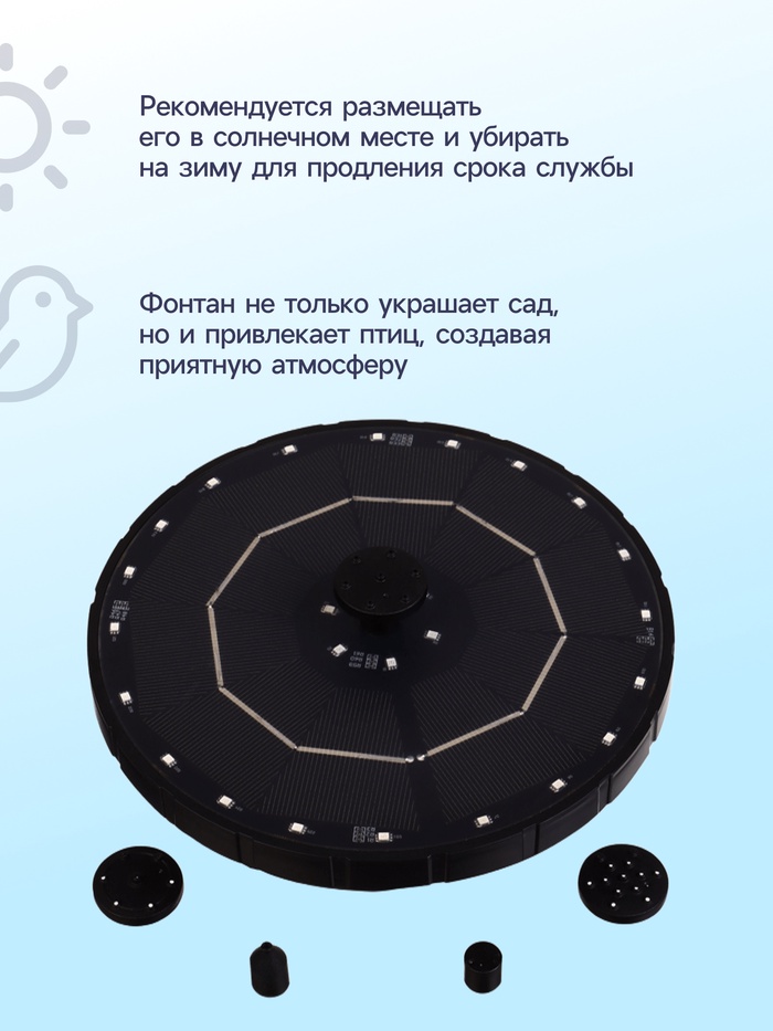 Фонтан на солнечной батарее, h=0,55 метра, 180 л/ч, 7 Вт, LED-подсветка, JT-180-26LED — Характеристики