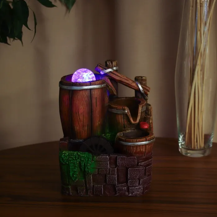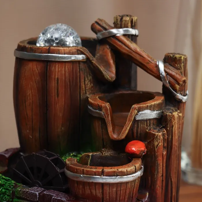 Создайте атмосферу уюта и спокойствия! Декоративный фонтан с бочками за каменной стеной добавит изысканный штрих в ваше пространство, становясь центром внимания в любом интерьере. Его размеры 20×16 см позволяют легко разместить фонтан в комнате или на даче, создавая эстетически привлекательную обстановку.