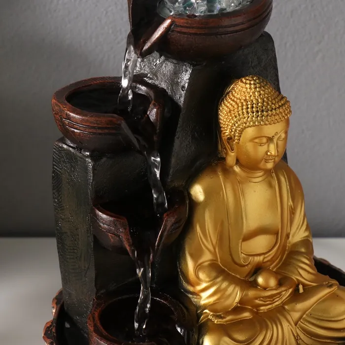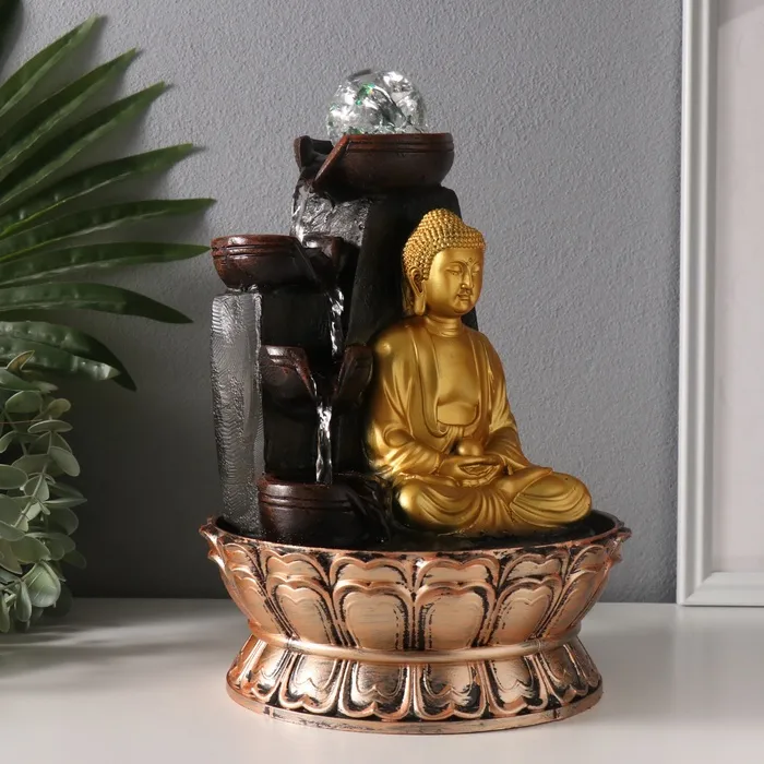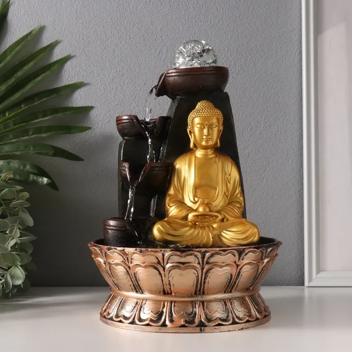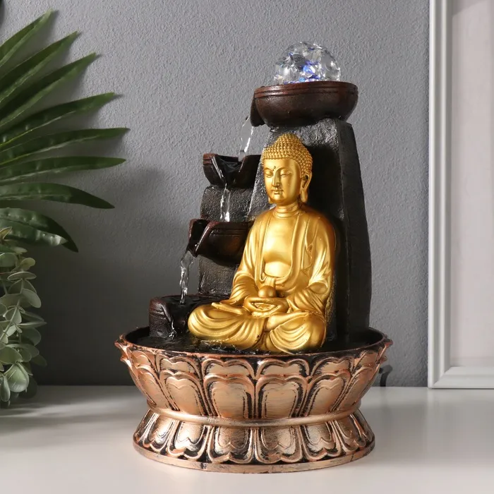 Фонтан настольный от сети, подсветка "Будда у скалы с чашами" золото 20х20х30 см — Характеристики
