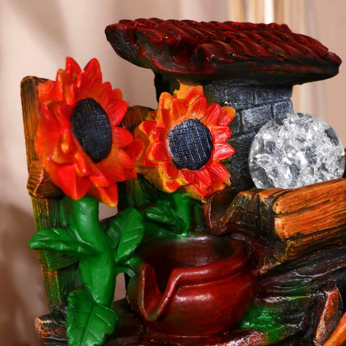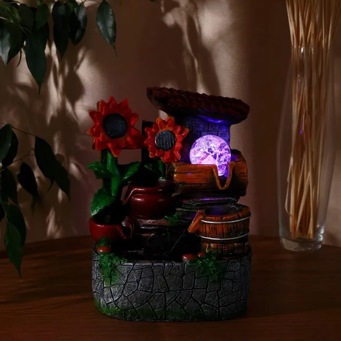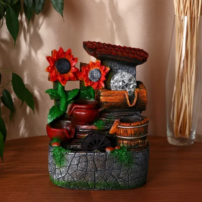 Этот настольный фонтан с подсветкой создаст атмосферу умиротворения и классической эстетики на вашем рабочем столе или в домашнем интерьере. Компактная модель вдохновлена образами загородного спокойствия, где солнечные цветы у каменной ограды напоминают о тёплом лете. Мерное журчание воды помогает сосредоточиться во время работы или полностью расслабиться после её окончания.