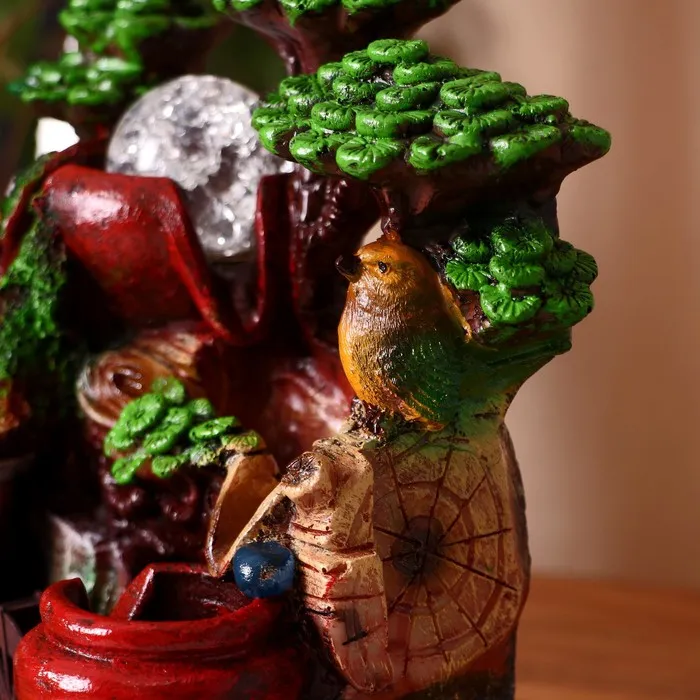 Фонтан способствует созданию комфортной и умиротворяющей обстановки, что прекрасно подходит для медитации или отдыха после долгого дня. Журчание воды поможет снять стресс и наполнить ваш дом положительной энергией. Птички на брёвнышке станут напоминанием о близости природы в вашем повседневном окружении.