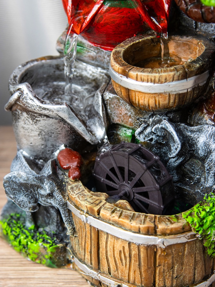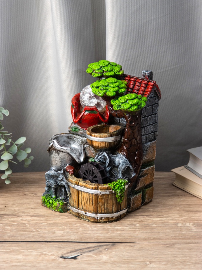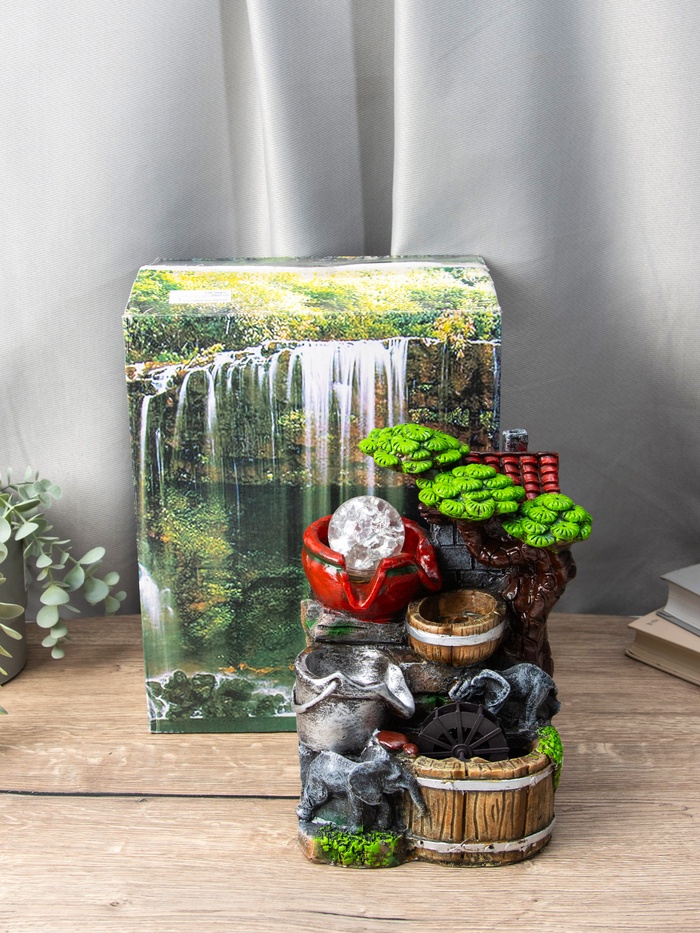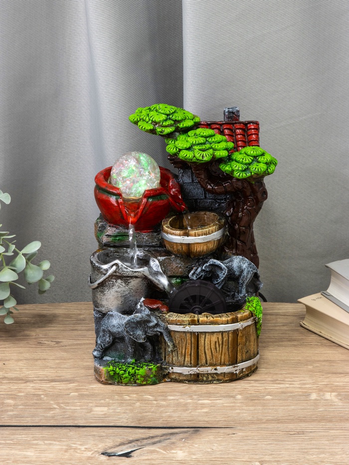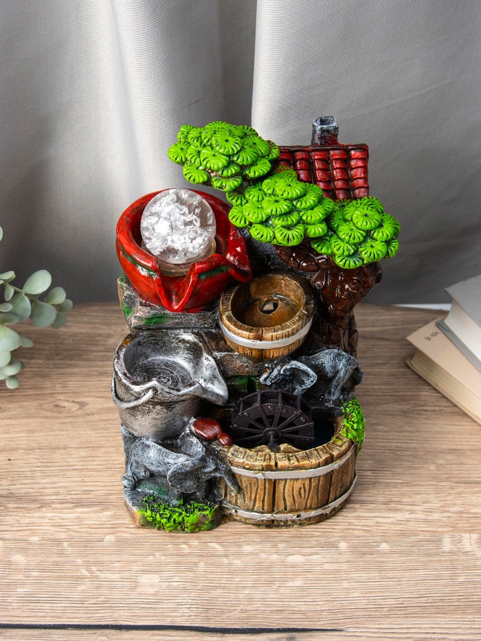 Этот декоративный фонтан с изображением слоников на мельнице — отличный выбор для тех, кто хочет добавить в интерьер элемент уюта и спокойствия. Его размеры 12×15×24 см позволяют разместить его в небольших пространствах, создавая атмосферу прохлады и умиротворения.