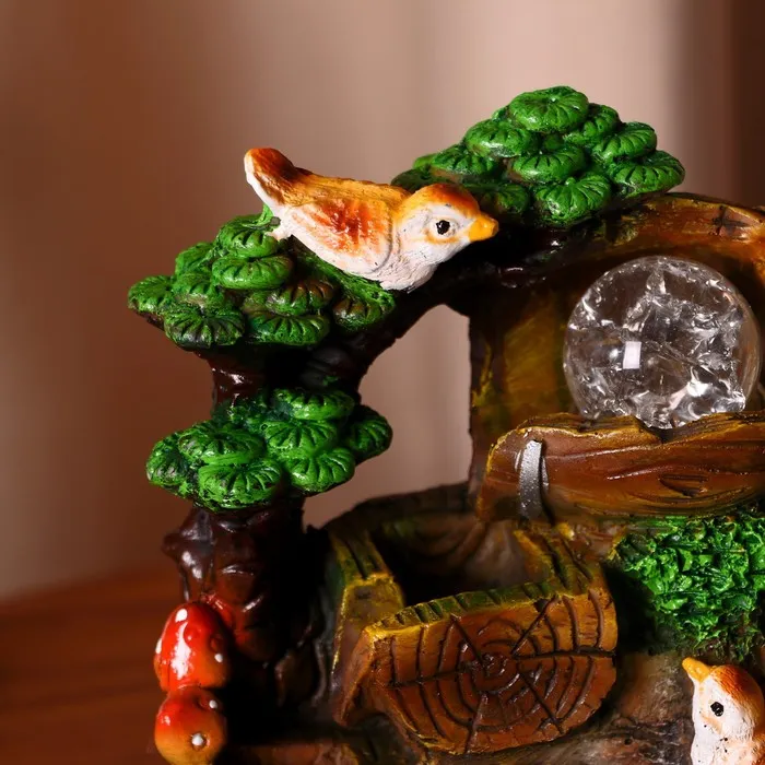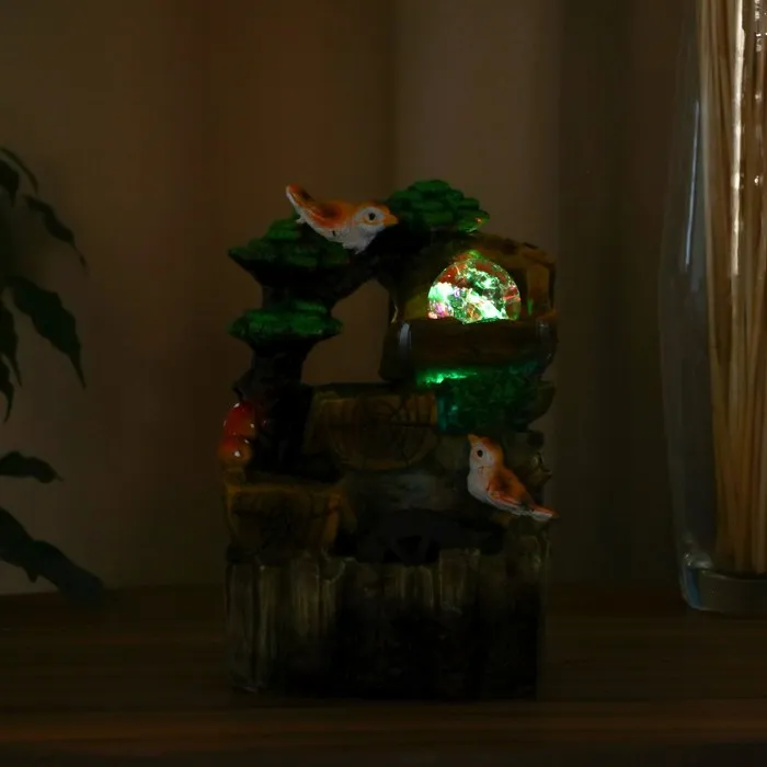 Оживите свой дом светом и гармонией! Декоративный фонтан с птицами и подсветкой придаст уникальность вашему пространству, превращая его в уютное и расслабляющее место. Компактные размеры 15×17×19 см позволяют разместить фонтан на полке, на столе или другой поверхности. Нужно лишь подключение к сети.