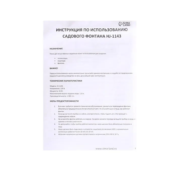 Фонтан садовый HJ-1143, 22 Вт, h=1.6 м, 1000 л/ч, шнур 5 м — Характеристики