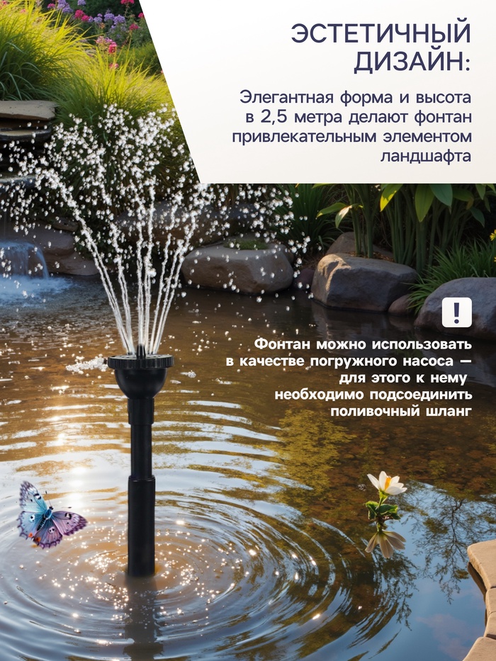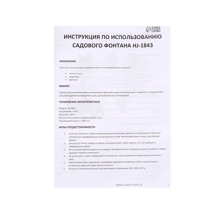 Фонтан садовый HJ-1843, 40 Вт, h=2.5 м, 1800 л/ч, кабель 5 м — Характеристики
