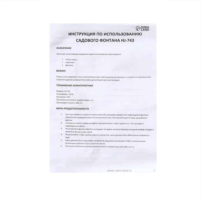 Фонтан садовый HJ-743, 8 Вт, h=1 м, 600 л/ч, шнур 5 м — Характеристики