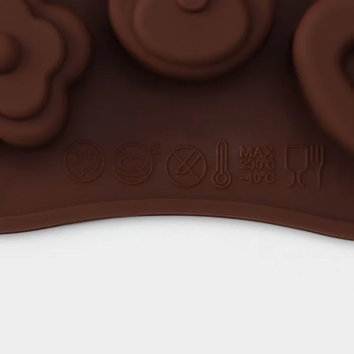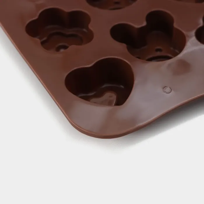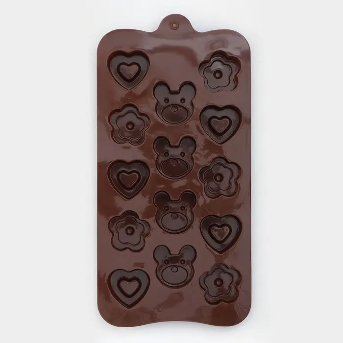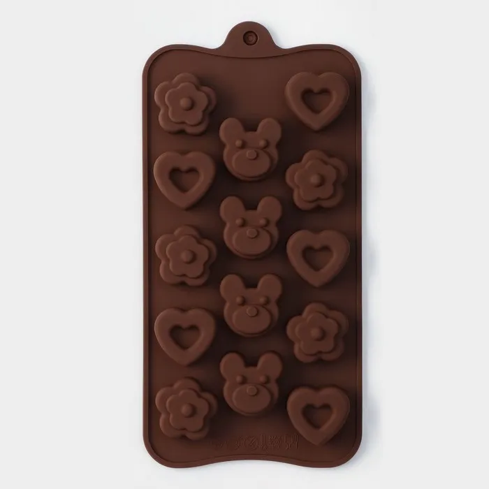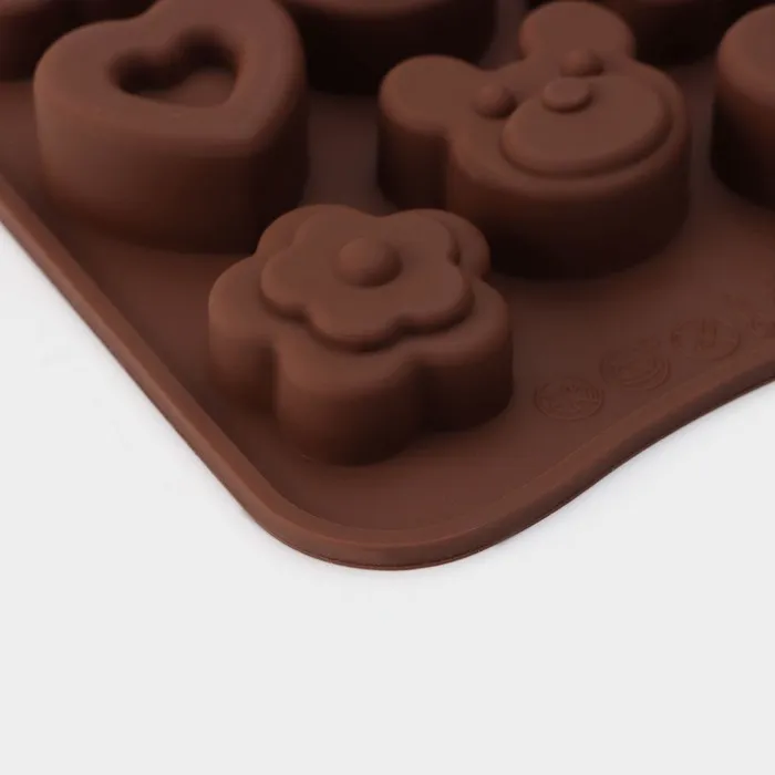 Форма для конфет и шоколада Доляна «Мишка, цветок, сердце», силикон, 19.7×10.5×1.5 см, 14 ячеек, коричневая — Характеристики