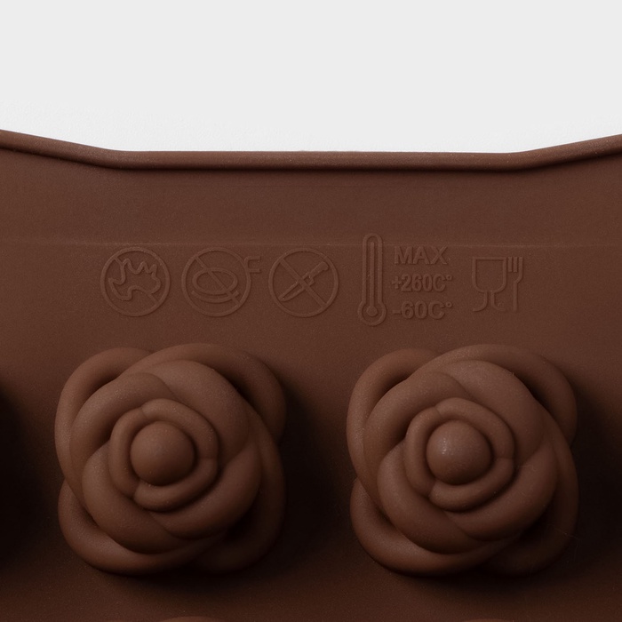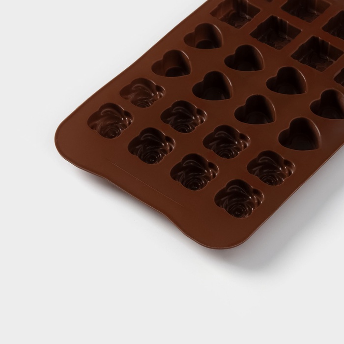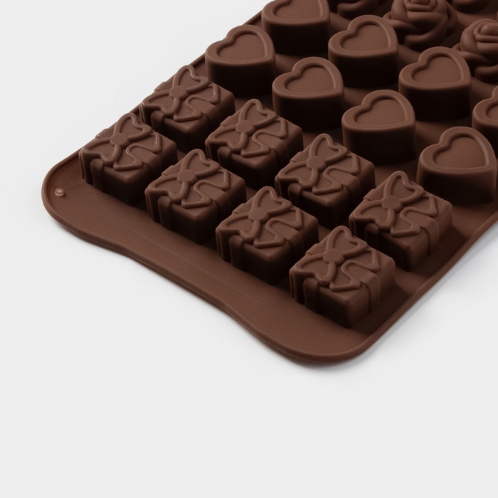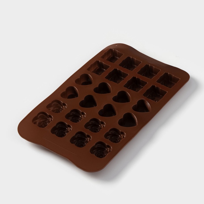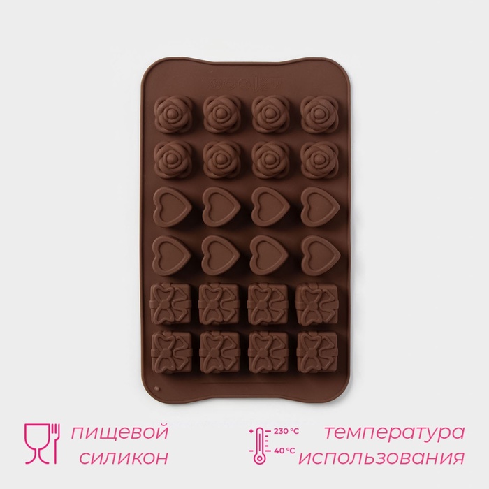 Форма для конфет и шоколада Доляна «Подарок, сердце, роза», силикон, 23.2×13.8×1.1 см, 24 ячейки (2.6×2.6×2 см), коричневая — Характеристики
