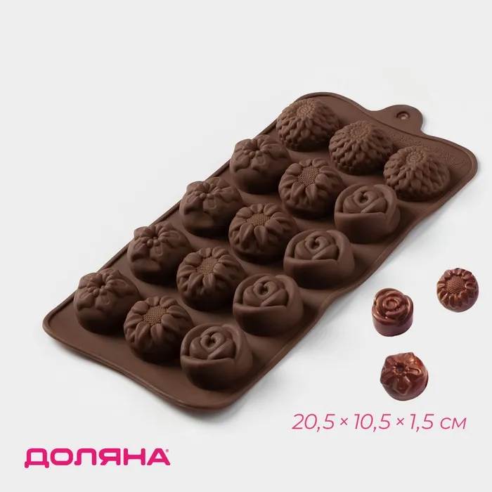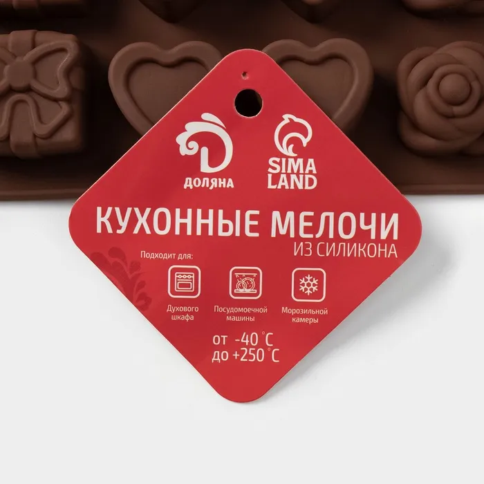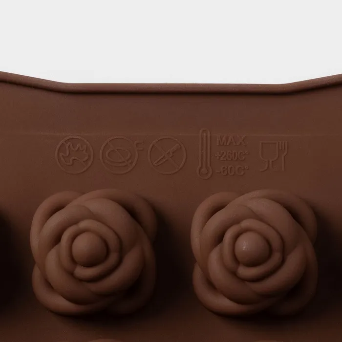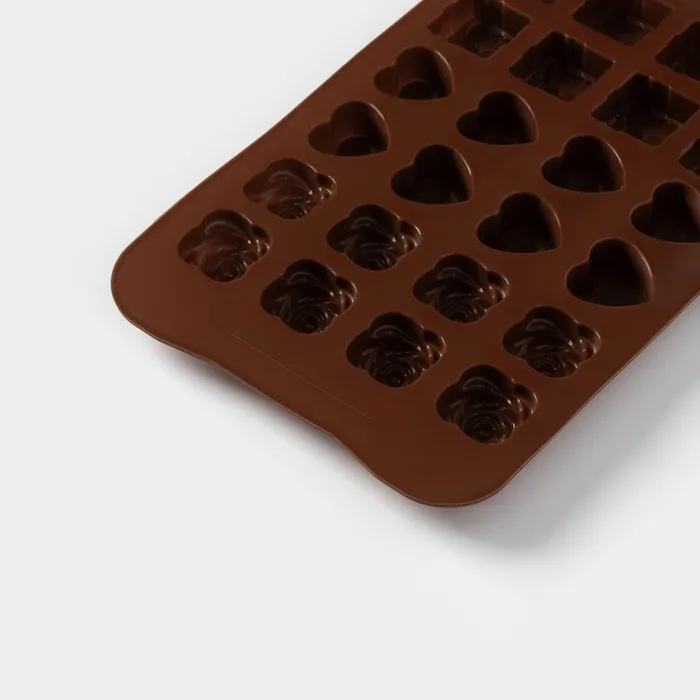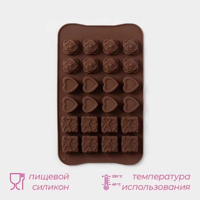 Форма для конфет и шоколада Доляна «Подарок, сердце, роза», силикон, 23.2×13.8×1.1 см, 24 ячейки (2.6×2.6×2 см), коричневая — Характеристики