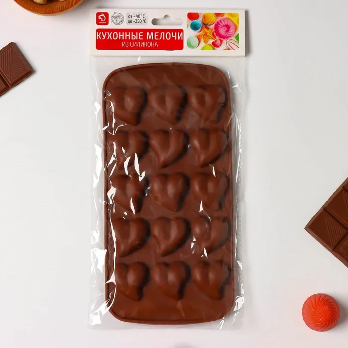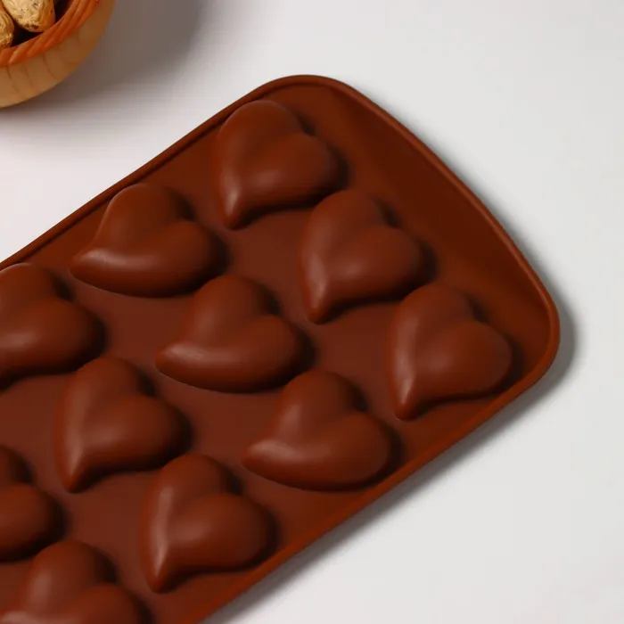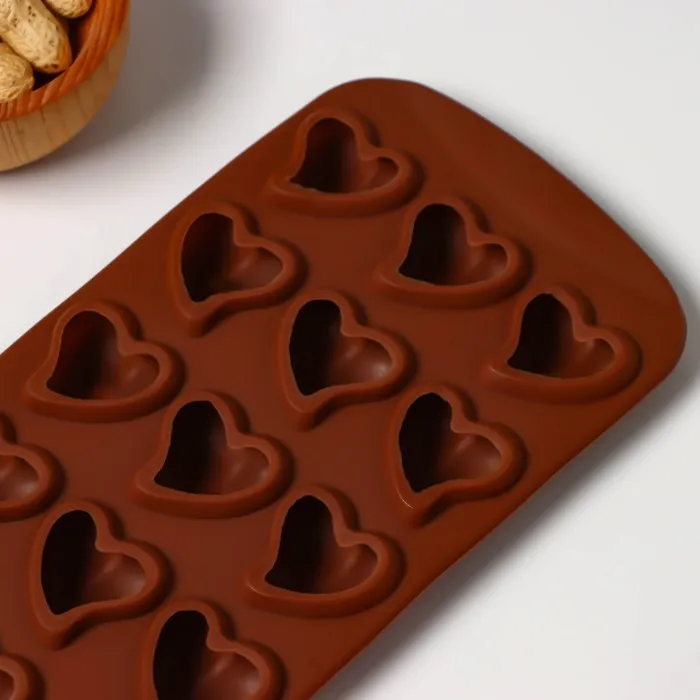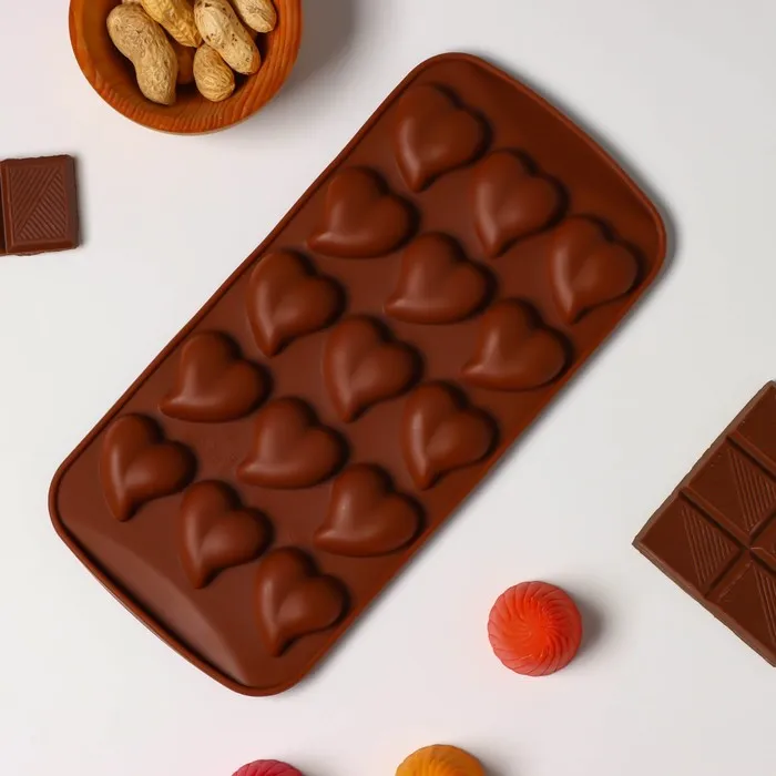 Форма для конфет и шоколада Доляна «Сердца», силикон, 21.5×10.5×1.8 см, 15 ячеек (3×3 см), коричневая — Характеристики