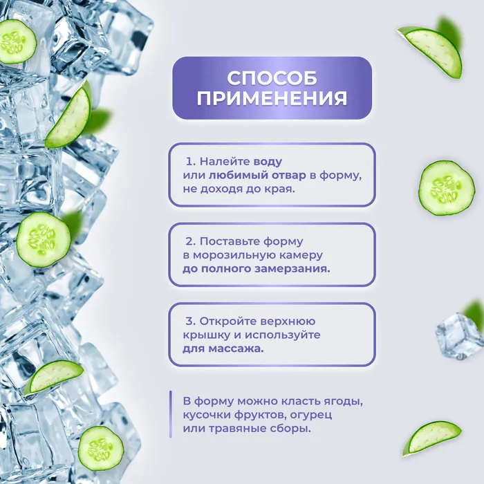 Наша форма изготовлена из высококачественного и безопасного материала, который легок в использовании и легко моется. Просто заполните форму водой, поместите в морозильник, и через несколько часов вы получите идеальный инструмент для криомассажа. Охлаждение помогает снять напряжение, успокаивает воспаления и придаёт коже здоровый блеск.