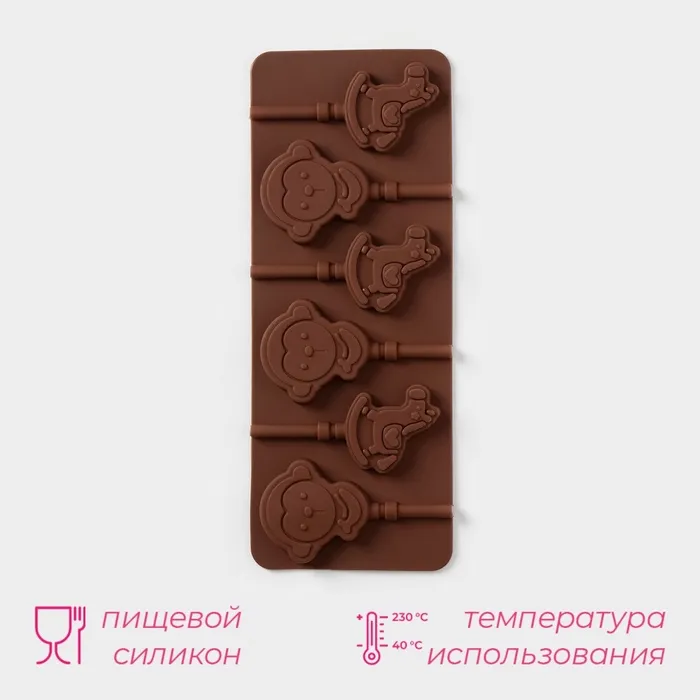 Форма для леденцов Доляна «Детство», силикон, 24×9.5 см, 6 ячеек (5×4.6), с палочками, коричневая — Характеристики