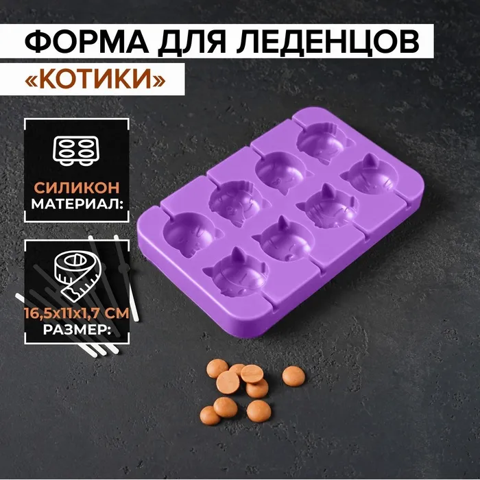 Форма для леденцов «Котики», силикон, 16,5×11×1,7 см, 8 ячеек, с палочками, сиреневая — Характеристики