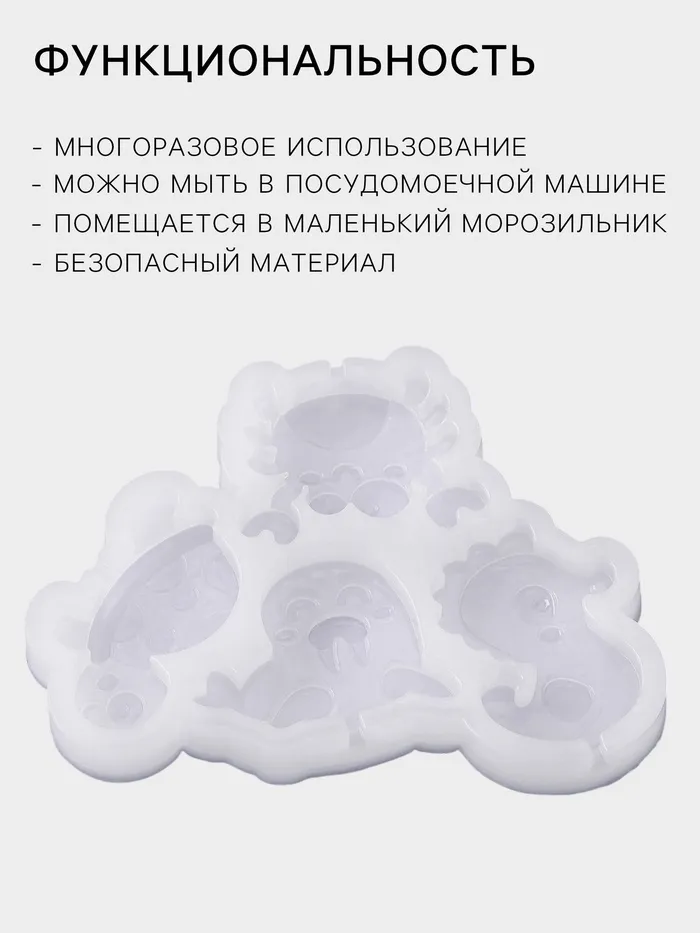 - Морской дизайн: Форма включает в себя четыре разных фигурки: рыбку, морского конька, краба и ракушку, создавая целую подводную композицию.
