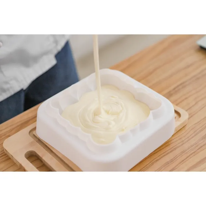 - Поставьте изделие на горизонтальную поверхность, чтобы мусс или тесто распределились равномерно.
