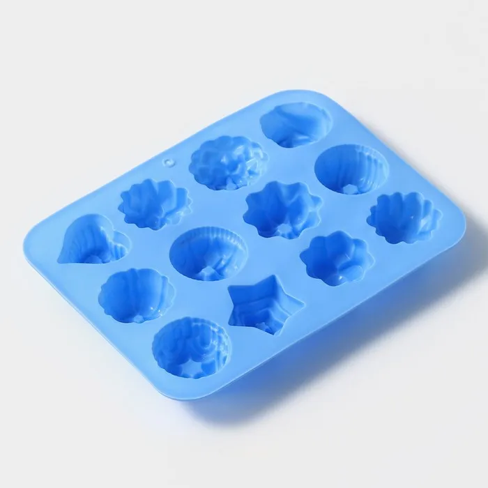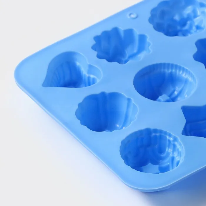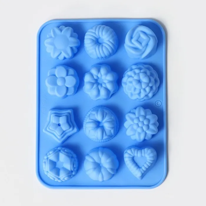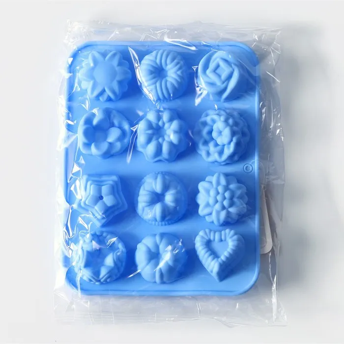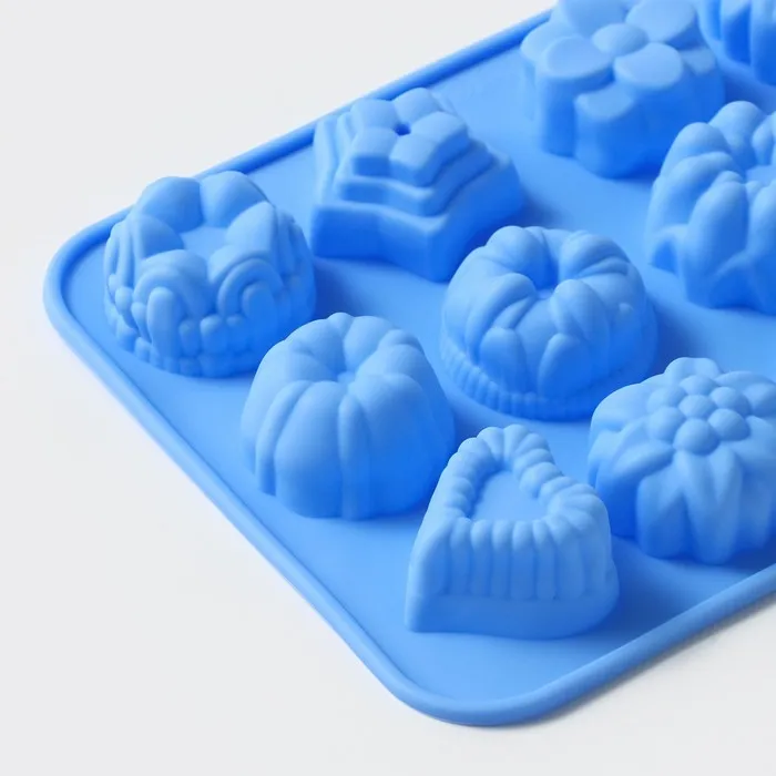 Форма для выпечки Доляна «Немецкий кекс, роза», силикон, 16×21 см, 12 ячеек (d=4.2 см), голубая — Характеристики