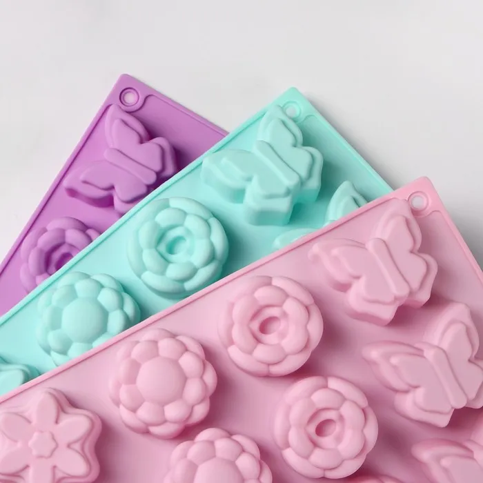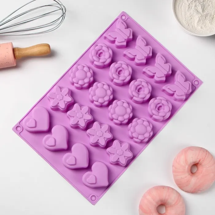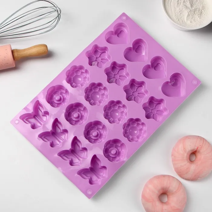 Форма для выпечки Доляна «Сердце, бабочка, цветок», силикон, 29.8×19.7 см, 20 ячеек (d=4.3 см), розовый — Характеристики