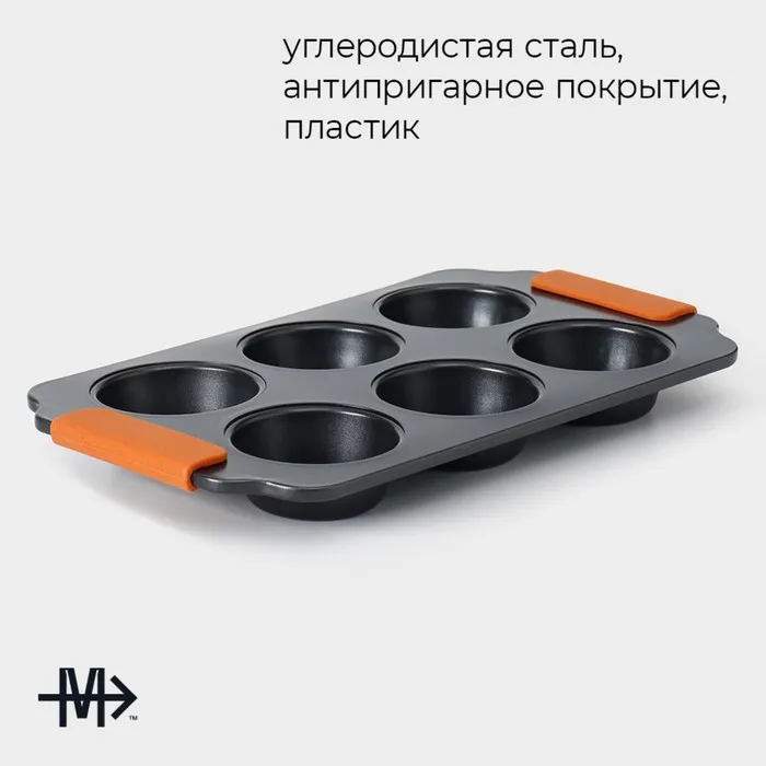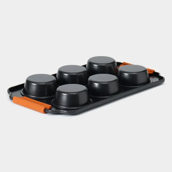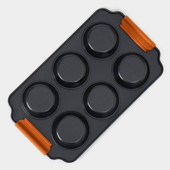 Форма изготовлена из углеродистой стали и имеет внутреннее антипригарное покрытие для легкого извлечения выпечки. Благодаря шести круглым ячейкам вы сможете приготовить несколько порций кексов или маффинов одновременно.