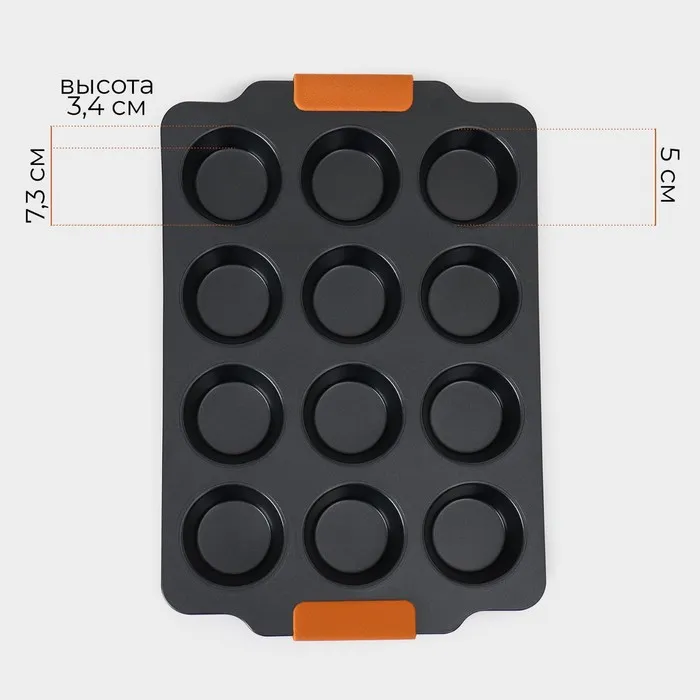 - 12 круглых ячеек: Форма имеет 12 отдельных ячеек, что позволяет приготовить большое количество выпечки за один раз.