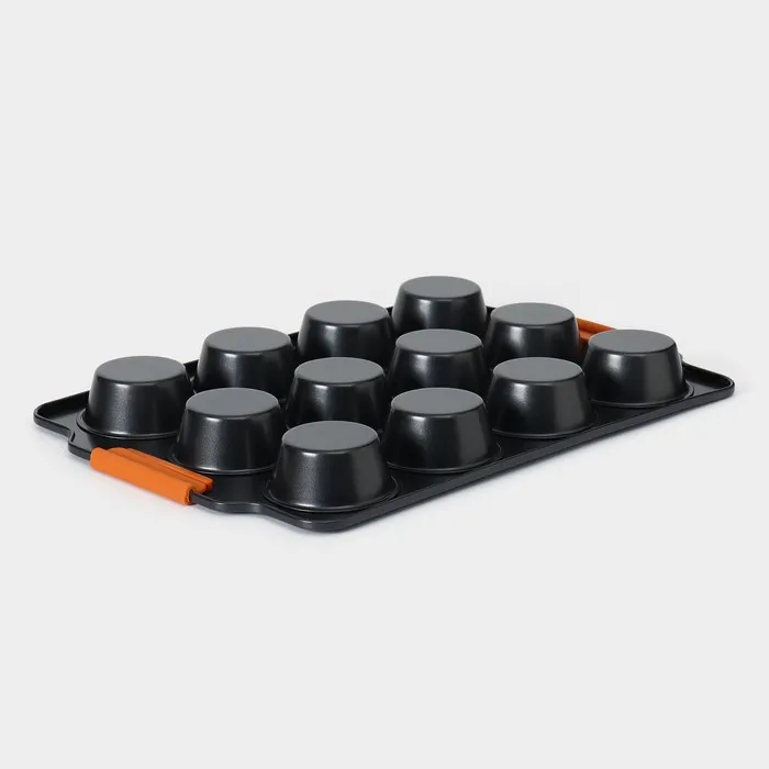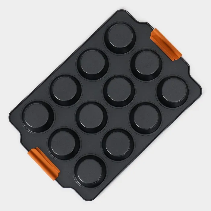 Форма для выпечки изготовлена из высококачественной углеродистой стали с внутренним антипригарным покрытием, что позволяет выпекать без использования масла или жира. Форма имеет круглую форму с 12 круглыми ячейками, что идеально подходит для выпечки небольших кексов, маффинов, печенья и других кондитерских изделий.