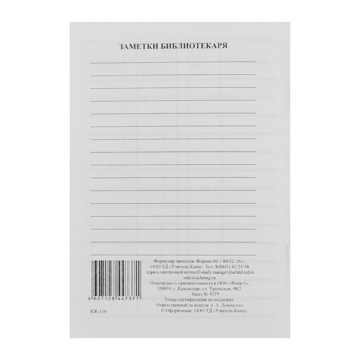 Формуляр читателя школьной библиотеки А6, 8 листов, офсет 80 г/м² — Характеристики