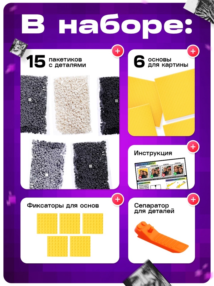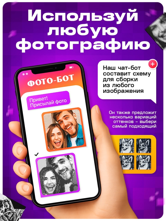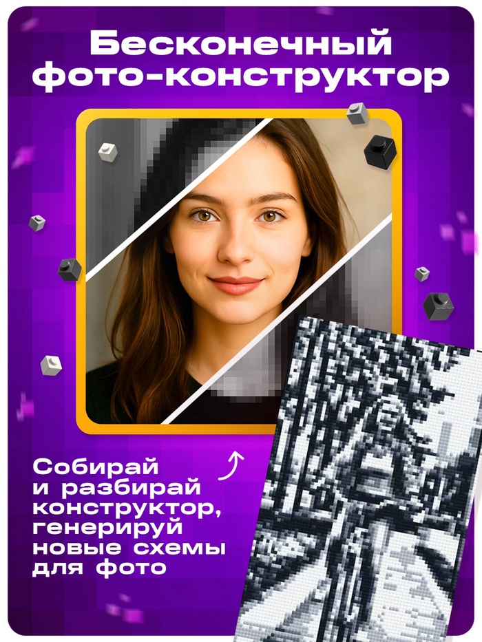 - Создайте портрет из 9000 деталей: загрузите свое фото через специального бота, получите индивидуальную схему сборки и начните творить. Каждый элемент – это часть большой картины, ваш собственный пиксель в огромном изображении.