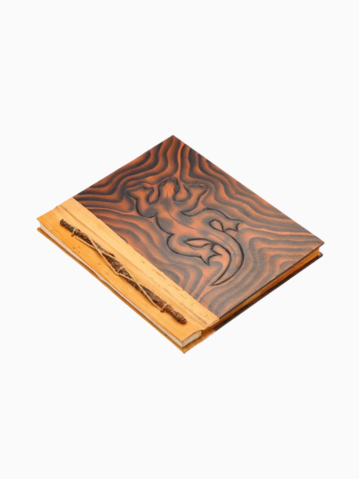 Фотоальбом «Ящерица» — альбом в твёрдой обложке из пальмового листа для хранения детских мгновений с лёгкостью и природной простотой. Его коричневый оттенок и фактура напоминают о тёплых днях, солнечных лучах и беззаботных шагах по летнему двору. Ящерица на обложке — не просто узор, а символ живости, гибкости и умения замечать красоту в мелочах.
