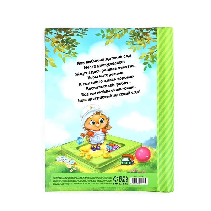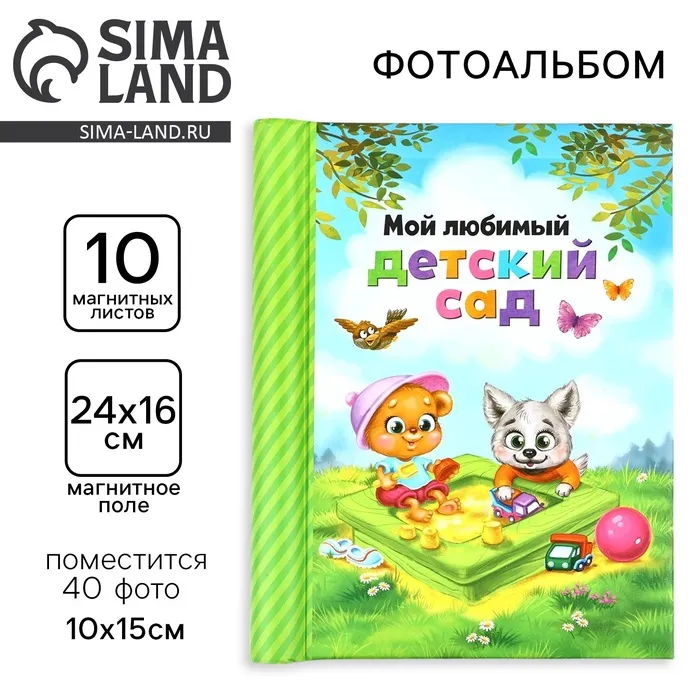 Фотоальбом магнитный на 10 листов для 40 фото «Мой любимый детский сад» красив, удобен и надёжен. Изделие состоит из толстых страниц, которые сверху закрываются прозрачной плёнкой. Она плотно примагничивается к страничке и держит снимки на месте.