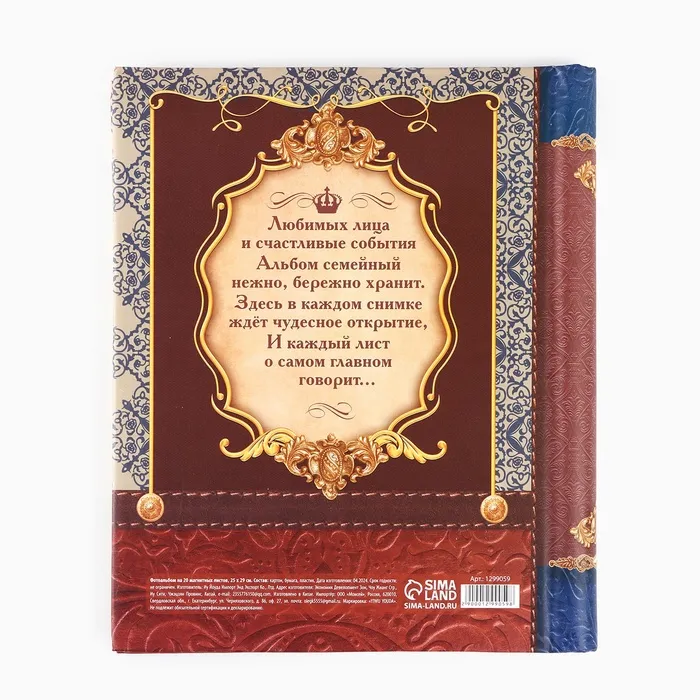 Альбом содержит 20 листов, каждый из которых вмещает по 2 фотографии 10 х 15 см.
