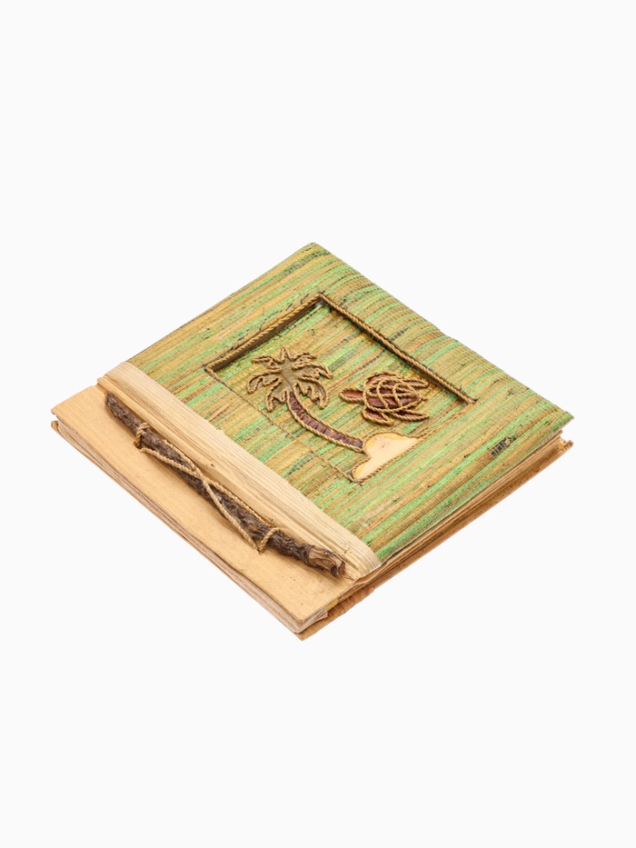 - Обложка из натурального пальмового листа — прочная, экологичная, с живой текстурой, подчёркивающей пляжную эстетику.