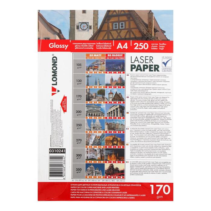 Фотобумага для лазерной печати А4, 250 листов LOMOND, 170 г/м2, двусторонняя, глянцевая — Характеристики