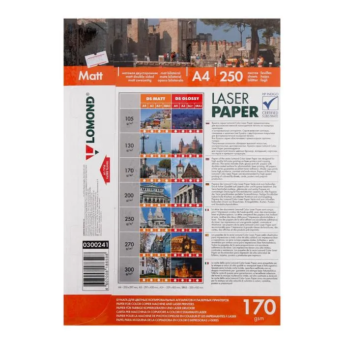 Суперкаландрированная двусторонняя бумага для печати изображений высокого качества с разрешением до 600 dpi.Бумаги серии Lomond Color Laser Paper предназначены для высококачественной полноцветной печати на лазерных принтерах и копировальных аппаратах. Серия включает матовые и глянцевые бумаги с двусторонним покрытием для фотореалистичной лазерной печати. Суперкаландрированная бумага со специальным многослойным покрытием, имеющая многофункциональное назначение обеспечивает превосходную адгезию тонера. Полученные отпечатки обладают высокой четкостью, контрастностью, долговечностью. Бумага Lomond Color Laser Paper рекомендуется для скоростной печати цветных брошюр, вкладышей, карточек, постеров; может с успехом использоваться для производства препринт-продукции. Все бумаги Lomond серии Color Laser сертифицированы для использования на цифровых офсетных машинах HP Indigo (R).