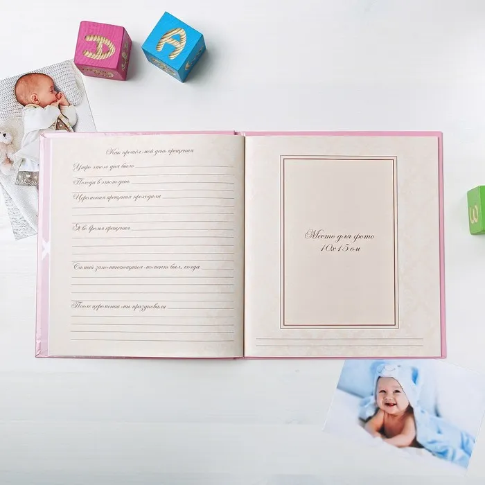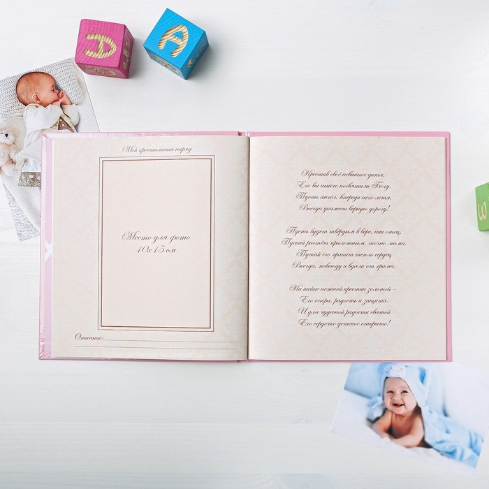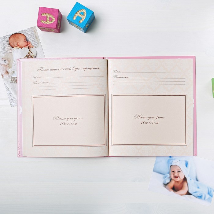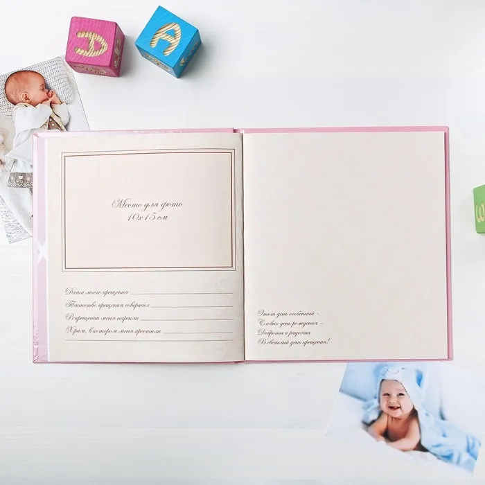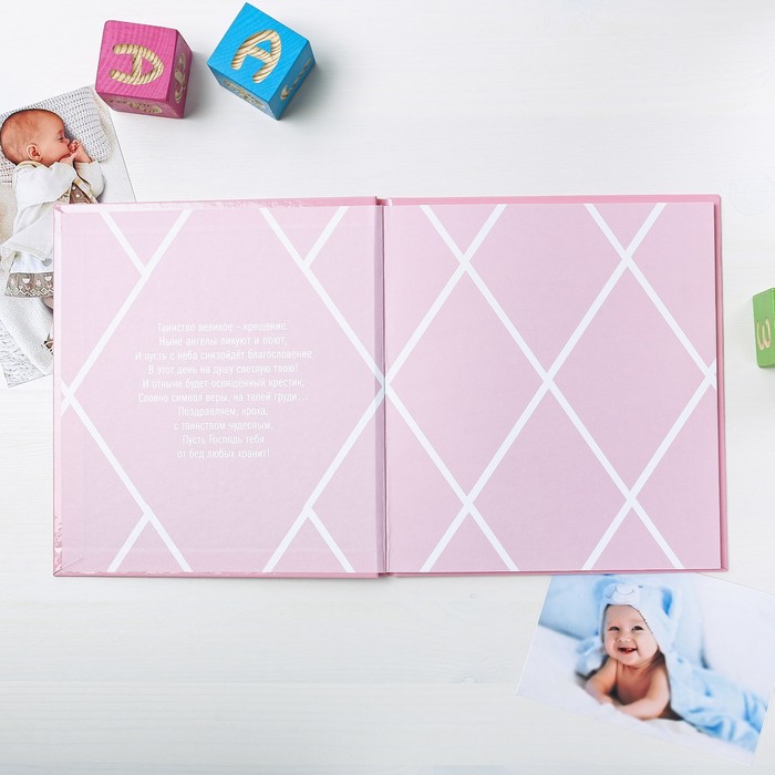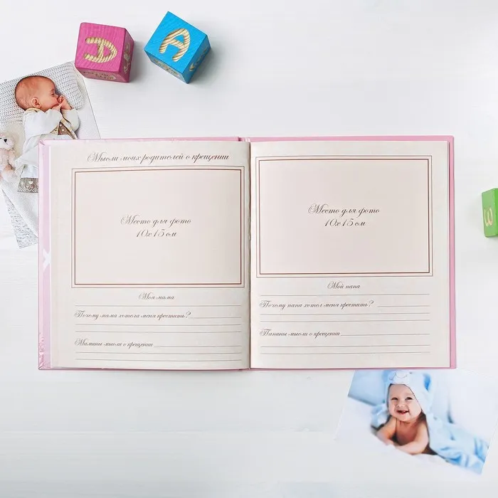 Фотоальбом сохранит воспоминания о таинстве и будет передаваться из поколения в поколение. Вложите внутрь фото погружения чада в купель, его первого осенения крестным знамением.