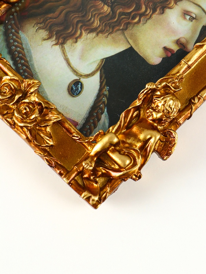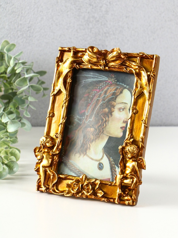 - Качество полистоуна: Материал точно передаёт фактуру и благородный оттенок бронзы. Рамка выглядит дорого и солидно, она прочная и устойчивая, а детализация фигурок ангелов отличается высокой чёткостью.