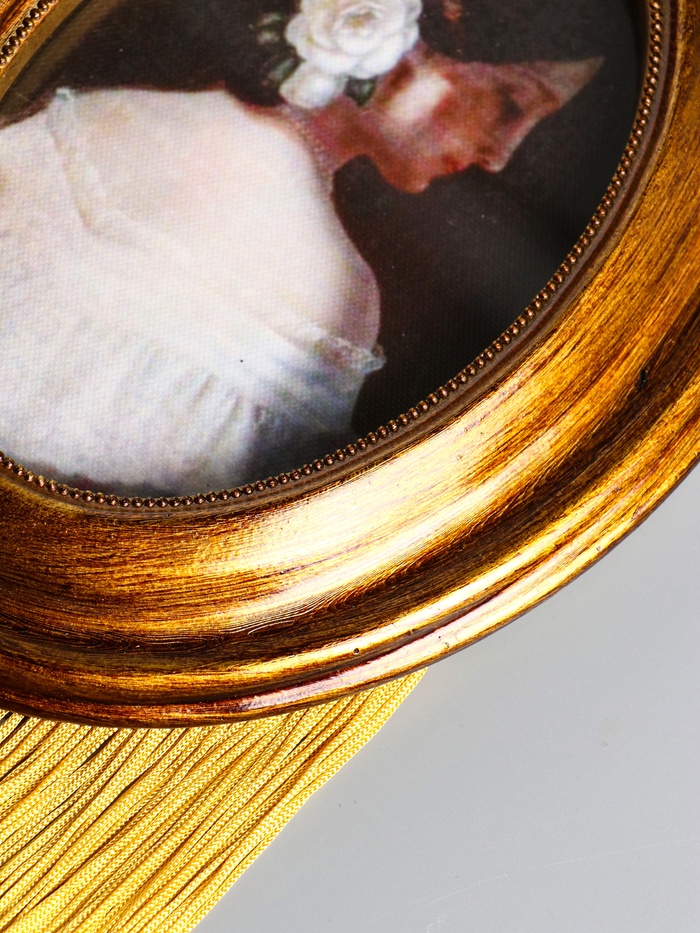 - Оригинальный дизайн: Главный элемент декора — объемный бант, золотистая текстильная бахрома. Такое оформление делает рамку самодостаточным предметом интерьера, который не теряется в общем пространстве.