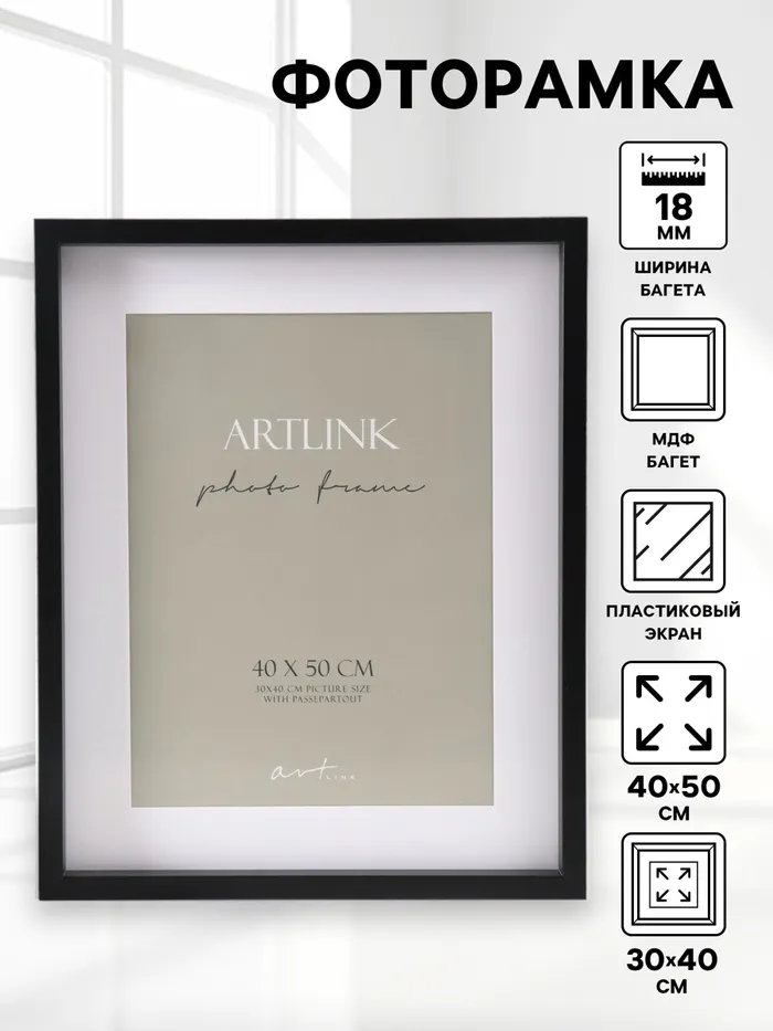 Фоторамка МДФ "Valerie" 40х50 см с паспарту 30х40 см, чёрный (пластиковый экран)