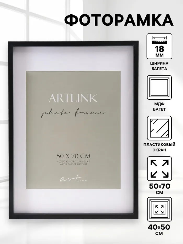 Фоторамка для фото 50×70 см Valerie, МДФ, с паспарту 40×50 см, чёрный, (пластиковый экран) — Характеристики